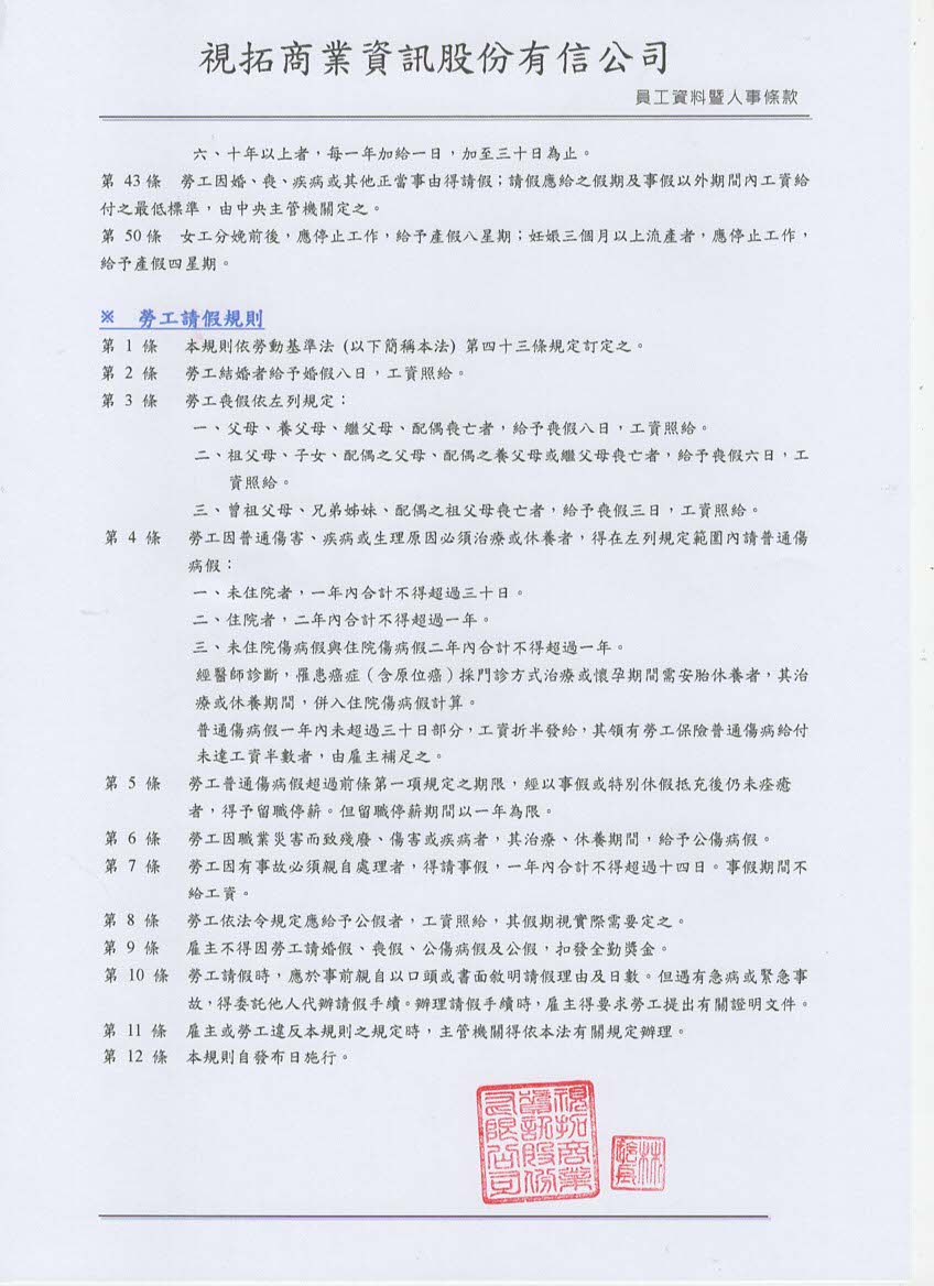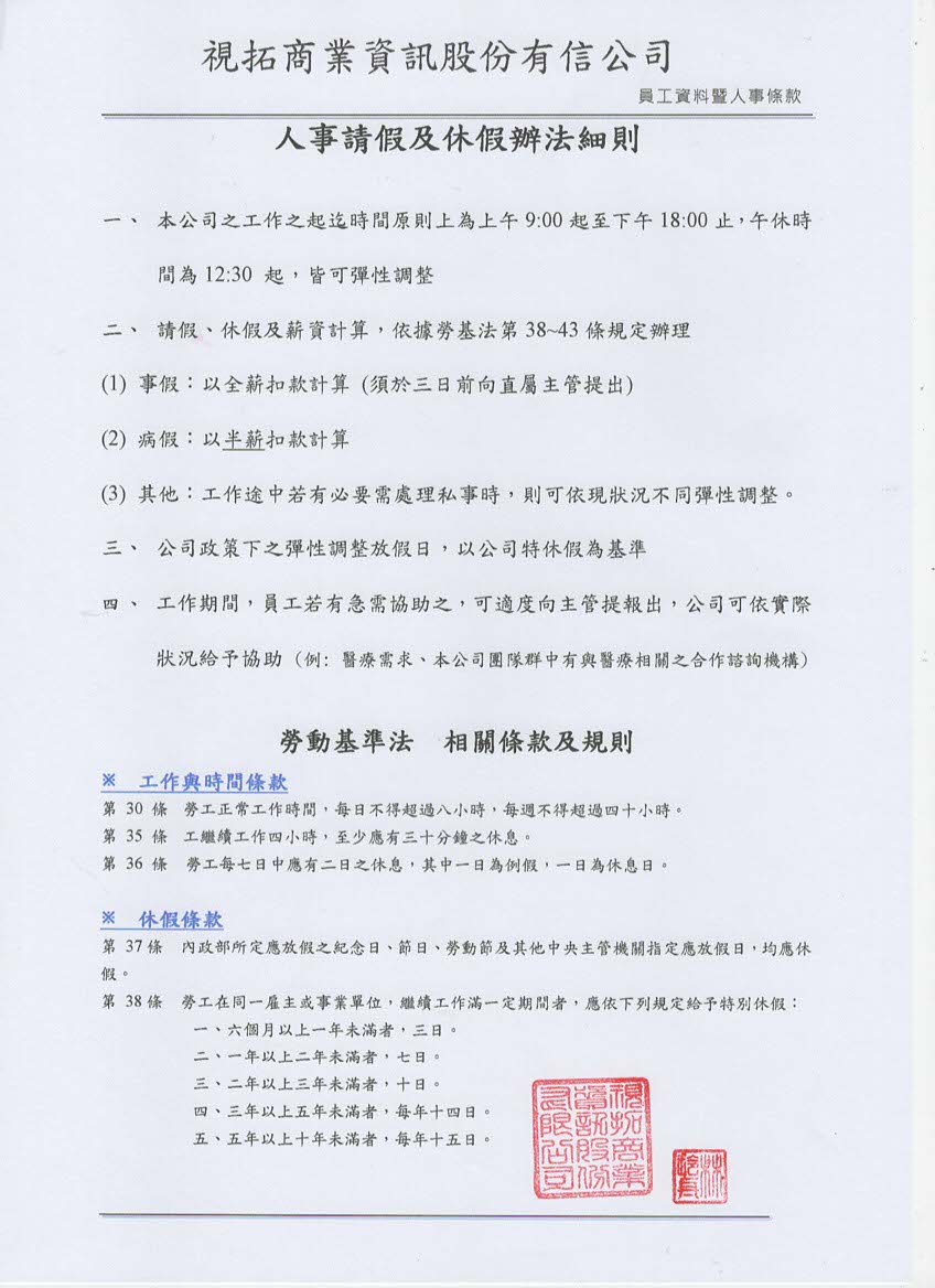 工作期間,員工若有急需協助之處,可向主管提出,公司應適度提供協助,另以優於勞動基準法法定正常工時規定,在每週正常工時40小時之前提下實施週休二日,這一措施旨在提高員工的工作滿意度,減輕工作壓力,促進員工的身心健康,進一步鞏固了公司對於「工作與生活平衡」的承諾:本項內容提供本公司勞動契約、工作規則提供說明,如下:
